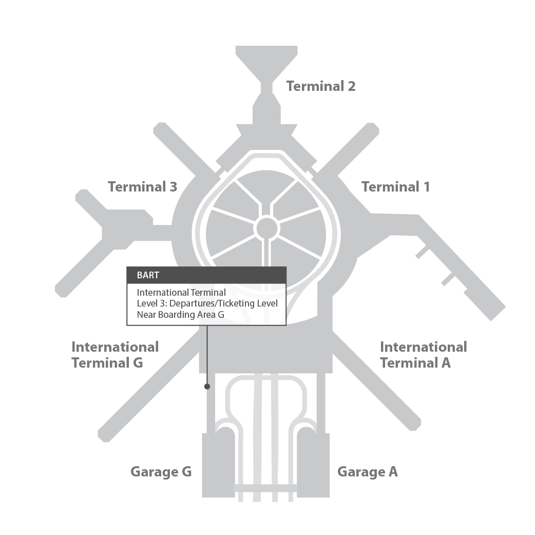 BART operates rapid rail service to northern San Mateo County, San Francisco and the East Bay directly from SFO. The SFO BART Station is located on the Departures/Ticketing Level of the International Terminal (G Gates side). BART is easily accessed from any terminal by riding SFO's AirTrain to the Garage G/BART Station stop. There is no charge to board AirTrain.